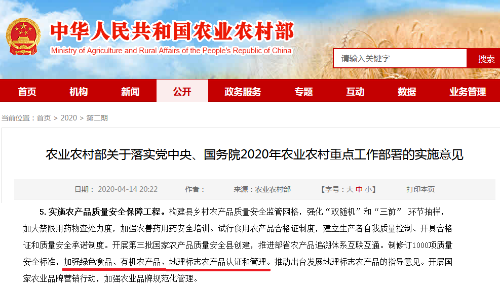 通知對于“加強(qiáng)綠色食品、有機(jī)農(nóng)產(chǎn)品、地理標(biāo)志農(nóng)產(chǎn)品認(rèn)證和管理,實(shí)施地理標(biāo)志農(nóng)產(chǎn)品保護(hù)工程,培育打造200個(gè)地理標(biāo)志農(nóng)產(chǎn)品。”的描述,要全面提高農(nóng)產(chǎn)品質(zhì)量安全水平。
