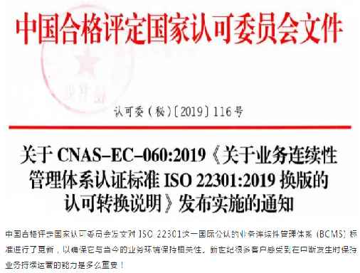 2019年12月31日,中國合格評(píng)定國家認(rèn)可委員會(huì)(CNAS)發(fā)布了關(guān)于CNAS-EC-060:2019《關(guān)于業(yè)務(wù)連續(xù)性管理體系認(rèn)證標(biāo)準(zhǔn)ISO22301:2019換版的認(rèn)可轉(zhuǎn)換說明》發(fā)布實(shí)施的通知。