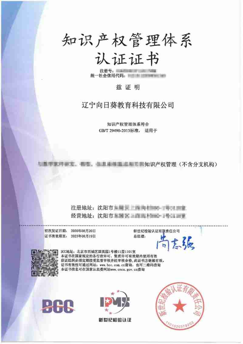 近日,向日葵教育科技順利通過(guò)知識(shí)產(chǎn)權(quán)管理體系認(rèn)證審核,喜獲由新世紀(jì)檢驗(yàn)認(rèn)證有限責(zé)任公司(簡(jiǎn)稱BCC)頒發(fā)的知識(shí)產(chǎn)權(quán)管理體系認(rèn)證證書。