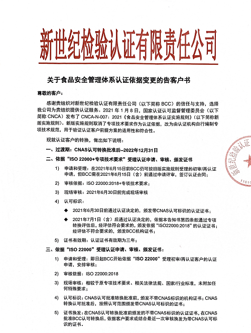 感謝貴組織對新世紀檢驗認證有限責任公司(以下簡稱BCC)的信任與支持,選擇我公司為貴組織提供認證服務。2021年1月8日,國家認證認可監(jiān)督管理委員會(以下簡稱CNCA)發(fā)布了CNCA-N-007:2021《食品安全管理體系認證實施規(guī)則》(以下簡稱新版實施規(guī)則)。新版實施規(guī)則取消了專項技術要求作為認證依據(jù),改為由認證機構自行編制專項技術規(guī)范,用于驗證認證客戶前提方案的適用性和符合性。