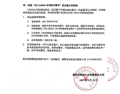 2021年7月1日(含)后通過認證決定的,依據(jù)本告知書第四條款通過專項轉換評估后,經(jīng)評估符合要求的,頒發(fā)依據(jù)“ISO22000:2018”的認證證書;經(jīng)評估不符合要求的,頒發(fā)BCC機構證書;