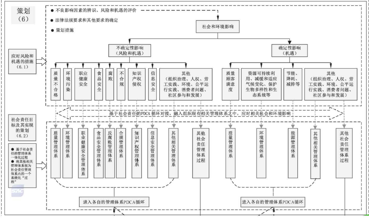 使組織能夠以社會責任為抓手,從頂層治理(價值觀、使命、精神和發(fā)展戰(zhàn)略等)視野出發(fā),統(tǒng)領、規(guī)范、協(xié)調和融合組織內其他相關管理體系(如質量管理體系、 環(huán)境管理體系、職業(yè)健康安全管理體系、食品安全管理體系、反腐敗管理體系、合規(guī)管理體系、知識產權管理體系、信息安全管理體系等),有效實現(xiàn)組織管理體系的一體化。