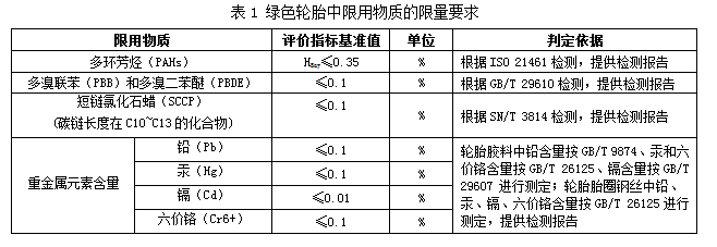 3、環(huán)境屬性。參照已發(fā)布并實施的《輪胎中限用物質(zhì)的限量要求》國家標準,對輪胎胎面、胎側(cè)、胎圈(除鋼絲以外部分)、三角膠、內(nèi)襯層、內(nèi)胎、墊帶、胎圈鋼絲等各部位的多環(huán)芳烴(PAHs)、重金屬(鉛、汞、鎘、六價鉻)、短鏈氯化石蠟(SCCP)、多溴聯(lián)苯(PBB)和多溴二苯醚(PBDE)等限用物質(zhì)提出了要求,具體評價指標基準值及判定依據(jù)詳見表1。